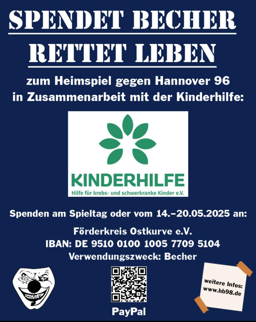 zum 20-jährigen Jubiläum unserer Spendenaktion „Spendet Becher – Rettet Leben“ hieß der Gegner erneut Hannover 96, wie bereits in der letzten Saison. Zum letzten Heimspiel vor 67.000 Zuschauern ging es sportlich für beide Teams um nichts mehr, sodass wir den Fokus voll und ganz auf unsere Spendenaktion legen konnten, die wir wieder in enger Zusammenarbeit mit der Fanszene von Hannover 96 durchgeführt haben.