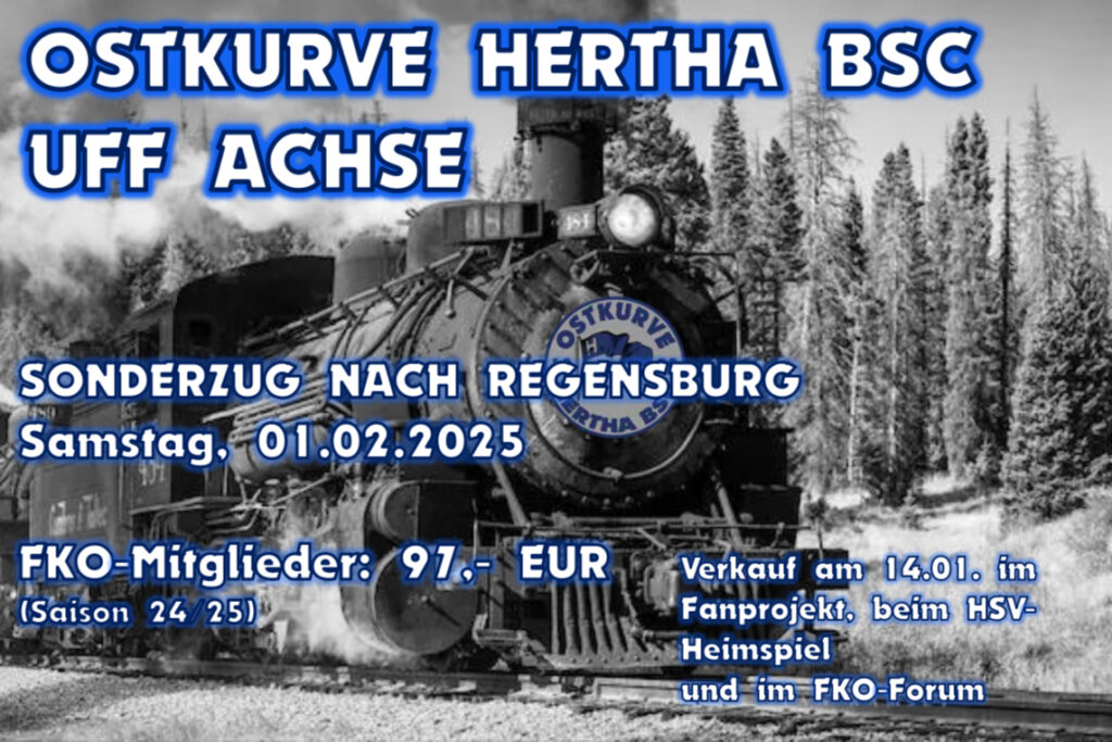 zum Auswärtsspiel in Regensburg am 01.02.2025 bietet der Förderkreis Ostkurve wieder einen Sonderzug inklusive Partywagen und DJ an.