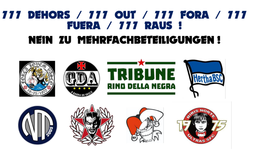 Wir, die Fans von Hertha BSC, Melbourne Victory, Red Star FC, FC Sevilla, Standard Lüttich und Vasco da Gama, vereinen unsere Stimmen, um den Investor anzuprangern, der Anteile an unseren Vereinen besitzt: 777 PARTNERS.