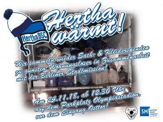 Vor dem Heimspiel gegen Hoffenheim, am Samstag den 24.11.2018, werden wir wieder bereitstehen und eure Kleider-/Sachspenden zu Gunsten der Berliner Stadtmission in Empfang nehmen. Wir werden uns, aufgrund der überwältigenden Resonanz in den vergangenen Jahren, mit einem LKW auf dem Parkplatz vor der Ostkurve positionieren. Mitarbeiter der Berliner Stadtmission werden die Aktion begleiten und stehen ebenfalls für Fragen zur Verfügung.