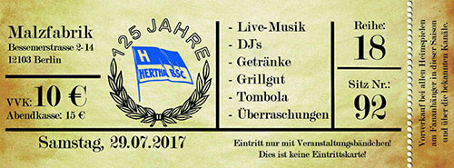 Die Ostkurve Hertha B.S.C. feiert am Samstag, den 29.07.2017 in der „Malzfabrik“ an der Grenze von Tempelhof zu Schöneberg (Bahnhof: Südkreuz / Ausfahrt: Alboinstraße) ihre eigene große Party zum 125-jährigen Jubiläum von Hertha B.S.C.! Es erwartet Euch jede Menge leckeres Grillgut, kalte Getränke, viel Musik und auch auf der Bühne wird sich die ein oder andere Berliner Größe die Ehre geben. Viele Überraschungen warten auf euch, sodass wir einen rundum gelungenen Abend verbringen werden.