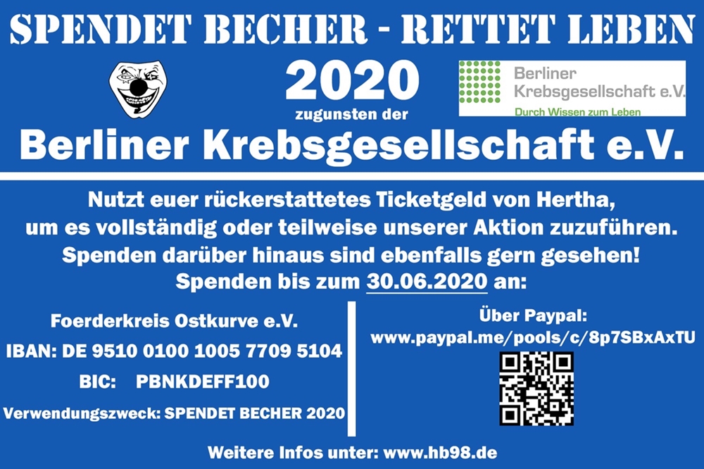 Durch die derzeitigen Corona-Umstände muss jeder Einschränkungen im privaten und öffentlichen Leben hinnehmen. So auch wir als Herthanerinnen und Herthaner, die keine Spiele unserer Hertha im Stadion besuchen dürfen. Aus diesem Grund können wir auch nicht wie gewohnt, die Aktion „Spendet Becher – Rettet Leben“ im Stadion durchführen, sondern verlagern das dieses Jahr hierher. So könnt ihr als Herthanerinnen und Herthaner euren Teil zu einer Spendenaktion, zugunsten der Berliner Krebsgesellschaft, beitragen.