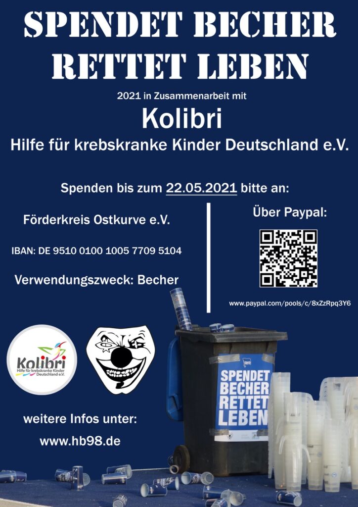 Aus diesem Grund laden wir euch dazu ein, Kolibri. e.V. finanziell zu unterstützen und damit euren Teil zu „Spendet Becher – Rettet Leben 2021“ beizutragen! Die Aktion läuft bis zum Saisonende am 22.05.21.