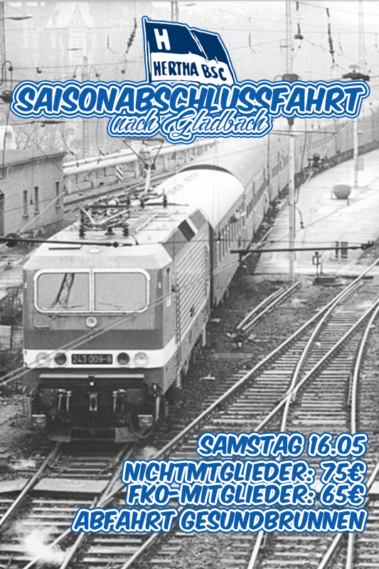 Zum Spiel nach Gladbach (Sa. 16.05.) wird es vom Förderkreis Ostkurve wieder einen Sonderzug geben. Der Verkauf der Zugtickets beginnt ab dem nächsten Heimspiel gegen Werder Bremen. Der Preis beträgt 65€ für FKO-Mitglieder und 75€ für Nicht-Mitglieder.